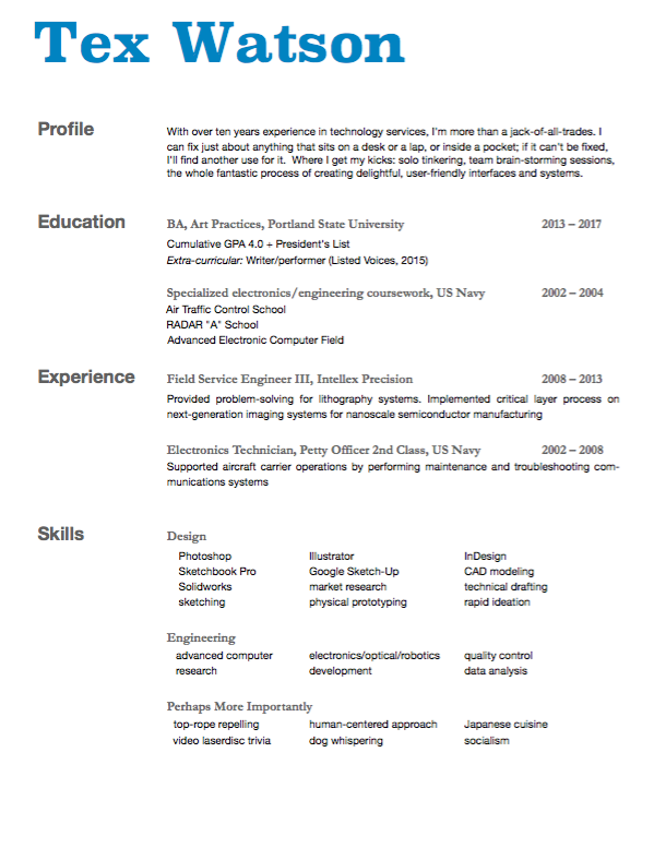 And just for good measure, here’s a recent counseling program graduate’s professional resume, and then the slightly more streamlined version I offered (PS he got the job!):